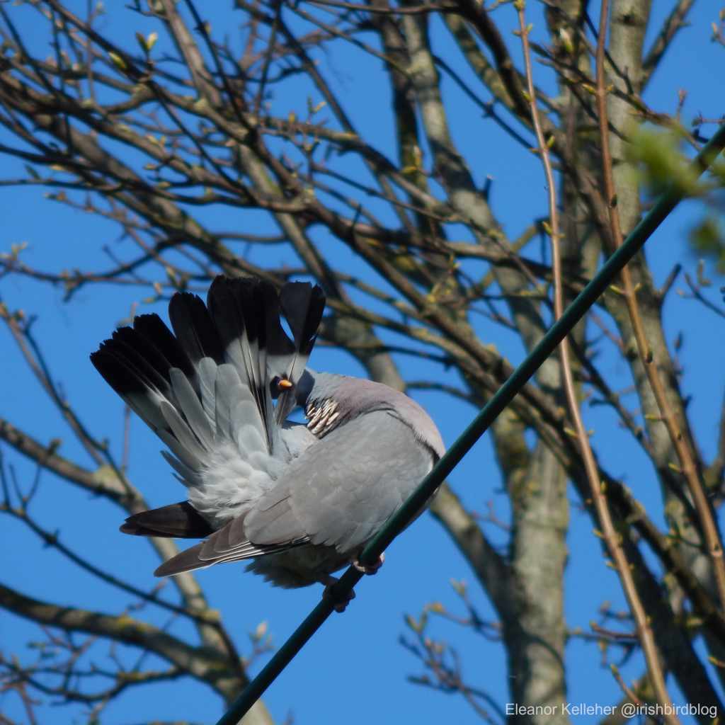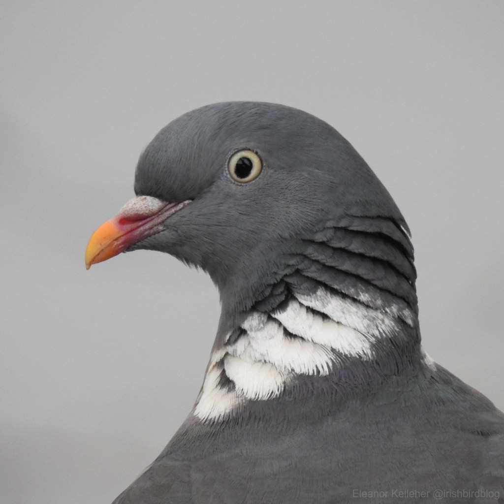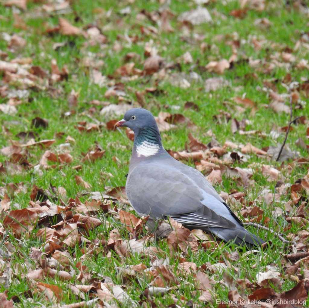 As mentioned in our last post, this month’s bird can be quite loud, quite clumsy, and, to some folks, quite a nuisance. If you haven’t heard its mournful cries or the clatter of branches when it takes off from a tree, you’ve almost certainly seen its dopey, glazed-over expression. We’re talking about the common woodpigeon (Columba palumbus), known as Colm coille in Irish.