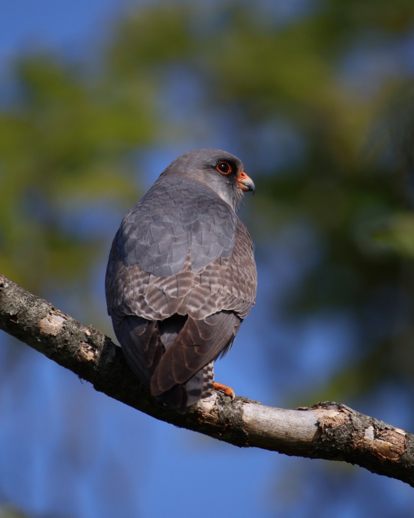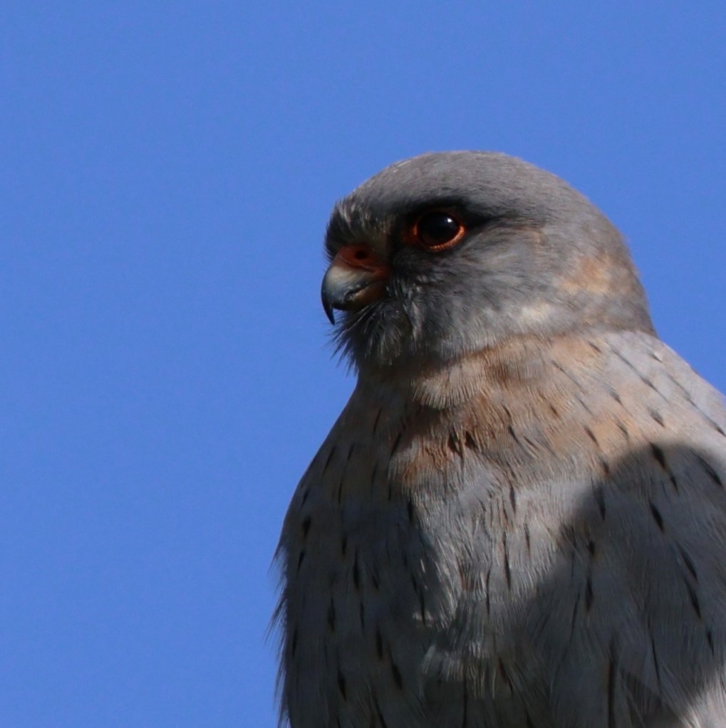 And they also have a link to another bird: rooks. Red-footed falcons don’t build their own nests, they tend to take over old disused nests in rookeries. For a bird of prey, they’re strangely social so the close proximity to one another is ideal, like living in a busy apartment block. Unfortunately, rook populations are declining in Europe, probably due to them being hunted for their perceived status of farmland pest. (Interestingly, red-footed falcons are a farmland boon since their favourite foods are locusts and grasshoppers.) Researchers in Europe have had luck putting up nest boxes for the falcons to nest in so all is not lost, though their numbers are dwindling due to habitat loss and hunting.