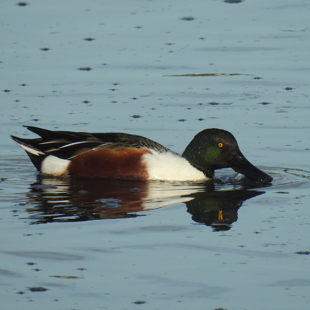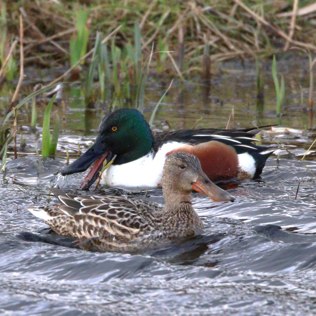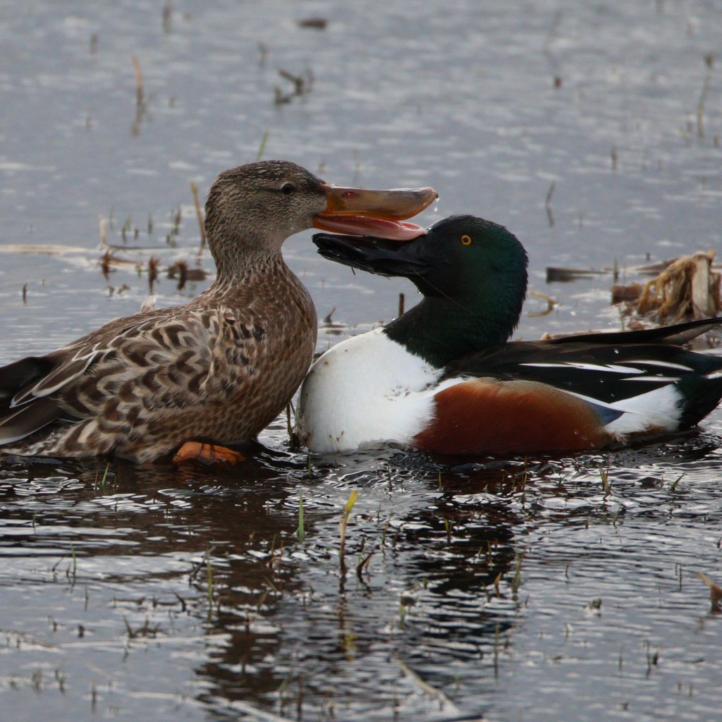 While we’re over here focused on the shoveler’s adeptness at weathering a storm, others are drawn to that enigmatic bill. In the USA, these birds are sometimes called “Hollywoods” or more specifically “Hollywood Ducks”. Apparently their bill makes them look like they’re smiling for the camera. (Did this name originate before or after the proliferation of Daffy Duck?) They’re also sometimes erroneously referred to as “spoonbills”, which are an entirely different species, and “bootlips”. I’m getting flashbacks to the early 2010’s, if you know, you know.