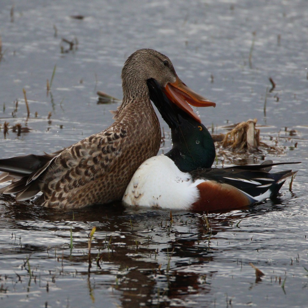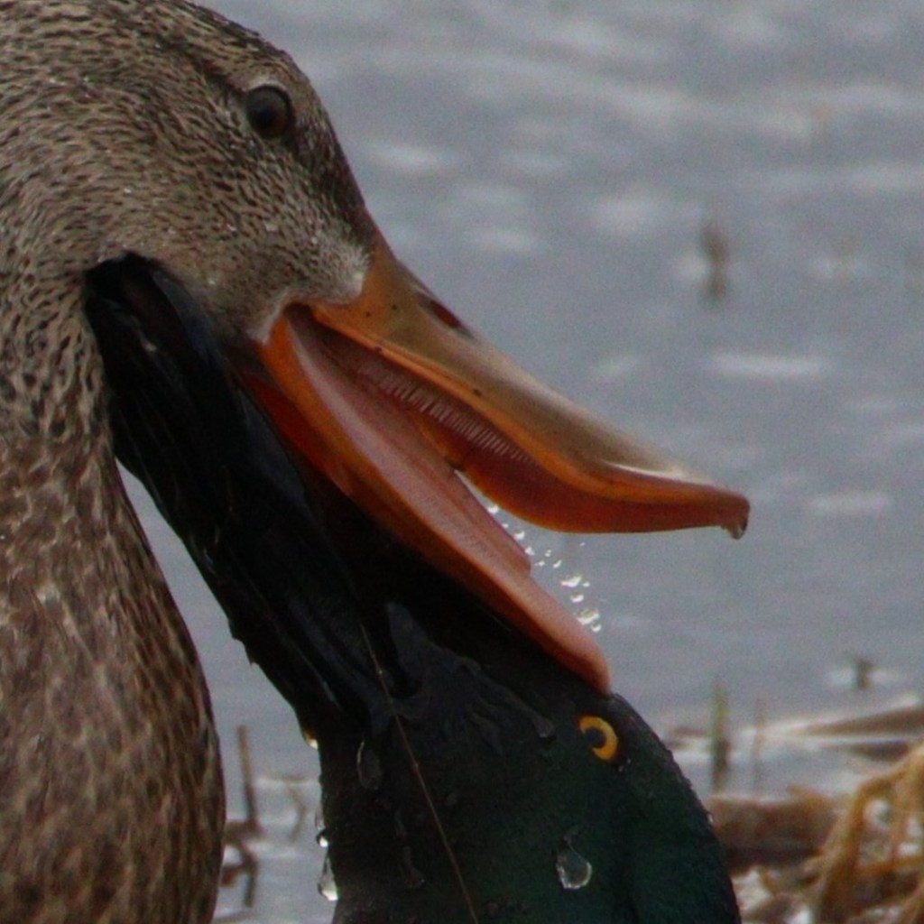 With all this raving about the shoveler’s big beautiful bill I’m sure you’re wondering what the reason is for the long face. Simple answer: longer bill make filtering for food easier. Shovelers are dabbling ducks (you may recall this from our mallard post), and the edges of their bills are lined with little, serrated, comb-like structures called lamellae (word of the day). These act like a sieve and filter zooplankton and little crustaceans out of the water and into their mouths. It’s not uncommon to see water gushing from the sides of their beak, like an artisanal fountain.